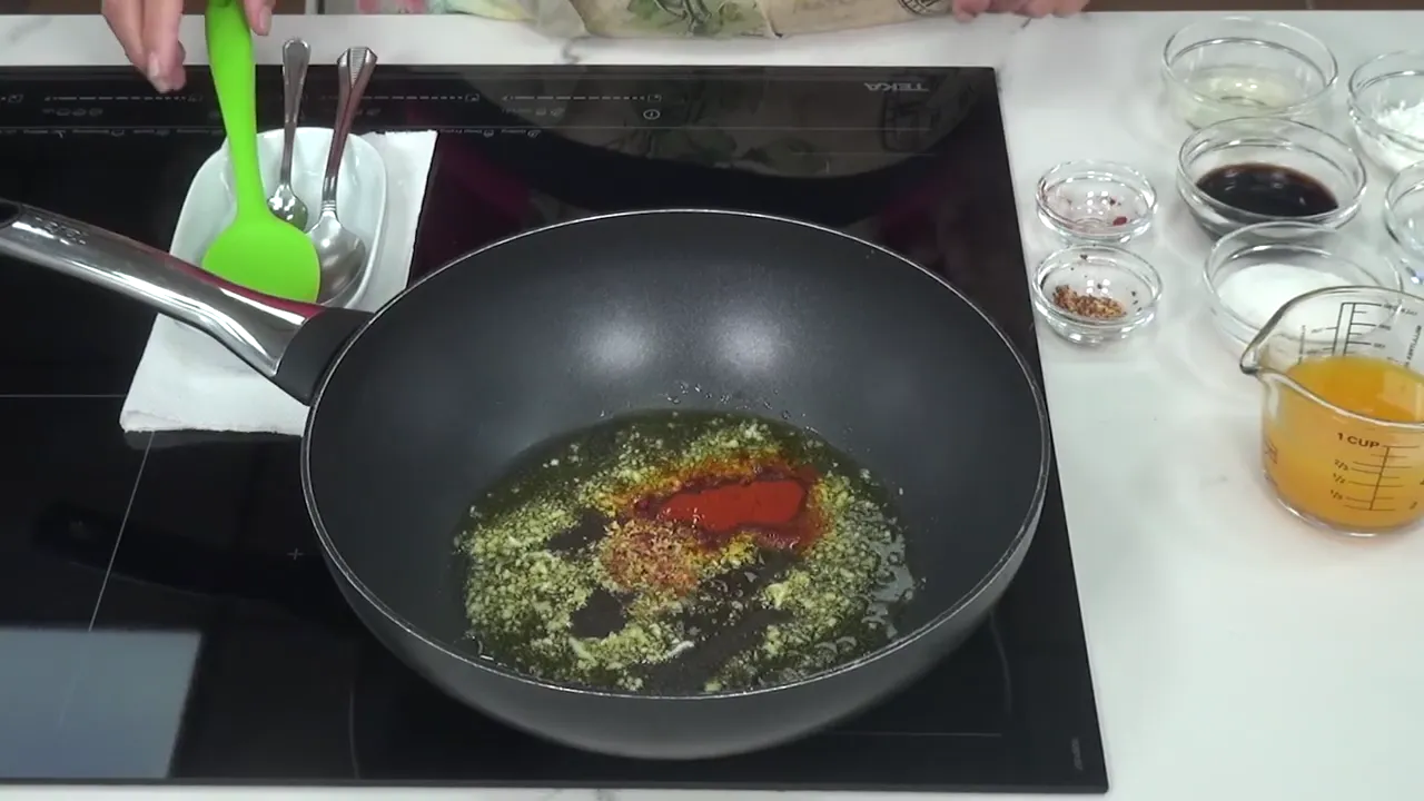 Preparamos la salsa: Sofreímos ajo picado en aceite a fuego medio. Añadimos pimentón dulce y picante al gusto, integrando bien antes de incorporar el zumo de naranja y azúcar.