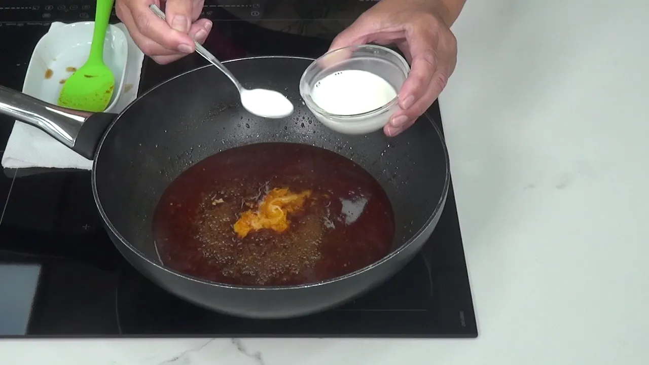 Cocinamos la salsa: Una vez que la mezcla hierve, añadimos salsa de soja y vinagre. Disolvemos maicena en agua y la agregamos poco a poco para espesar la salsa al gusto.