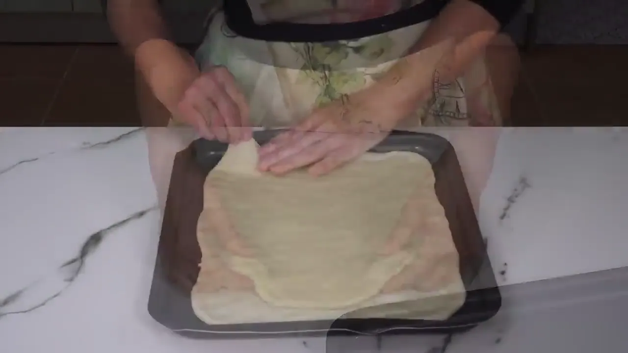 Estira la masa en dos partes, una más grande que otra para la base. Coloca la parte más grande en una bandeja ligera con aceite, creando un rectángulo que cubra los bordes.