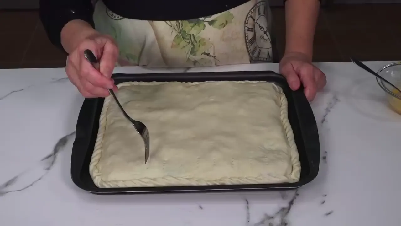 Estira la parte superior de la masa y cubre la empanada. Presiona los bordes para cerrarla bien y pincha la parte superior con un tenedor para que no se hinche durante la cocción. Haz una chimenea en el centro para liberar el vapor y pincela con huevo batido.