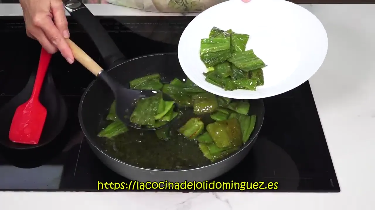 En una sartén, calienta abundante aceite de oliva virgen extra a fuego medio-alto. Añade los pimientos verdes cortados en trozos y una pizca de sal. Fríe hasta que estén tiernos durante unos minutos y luego retíralos y resérvalos.
