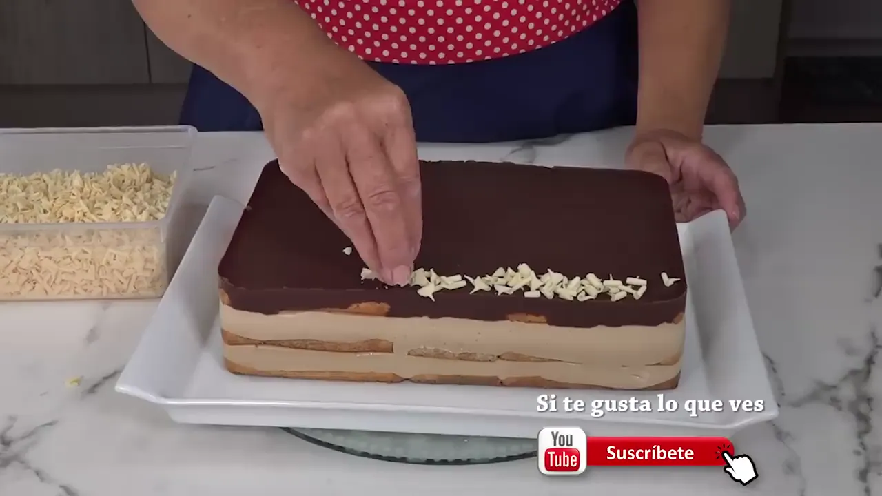 Cubre con otra capa de bizcochos mojados. Vierte el resto de la crema y extiende. Vuelve a cubrir con bizcochos y refrigera por al menos 2 horas.
